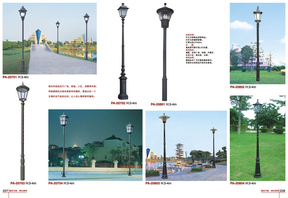 心情明朗而愉快。材質說明:燈頭為鋁制品或鐵制品;燈桿為熱鍍鋼管;燈罩為進口PMMA。光源:高亮度節能燈或LED光源適用場所:道路、休閑廣場、校園、風景區、生活小區、商業街、公園。特別說明:基礎由本廠另外提供圖紙制作。安裝時必須保證燈體安全接地。